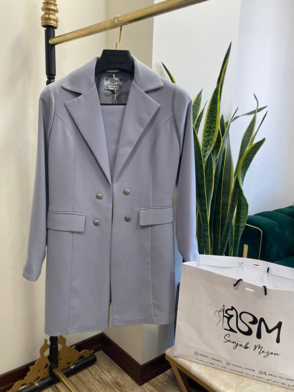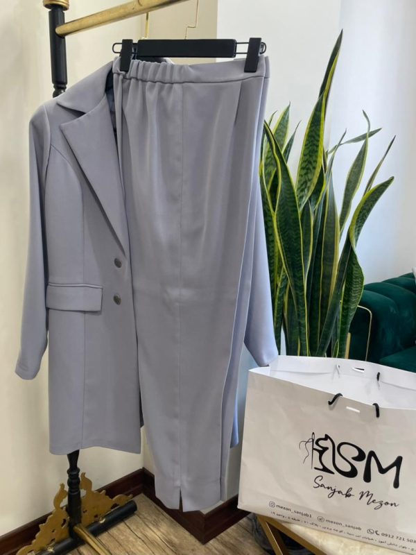 نمونه کت شلوار مجلسی زنانه طوسی در دو سایز 42 و 44 و 46 موجود میباشد.